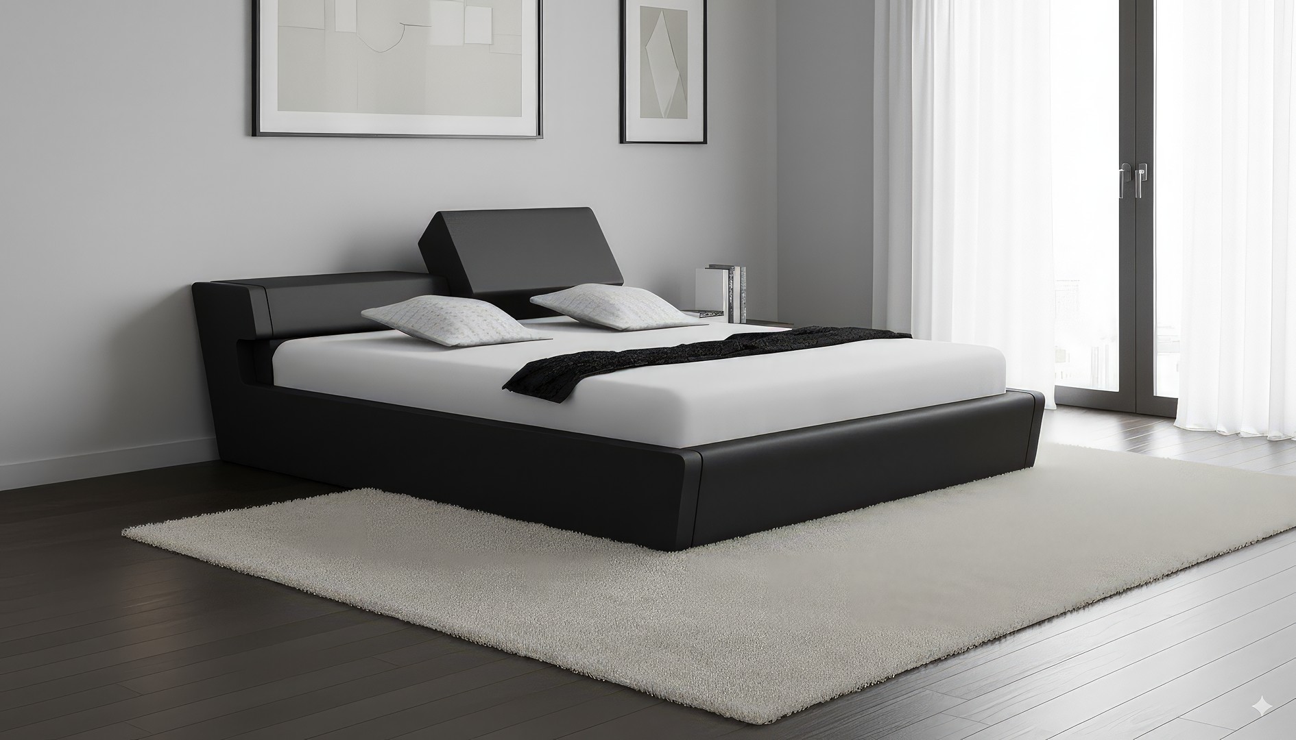 Nowoczesna forma łóżka, które jest nisko osadzone a jego wezgłowie jest podwyższone idealnie  powoduje że mebel  pięknie wygląda w każdym pomieszczeniu .